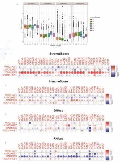 To identify the relationships between the key mRLs and immune features in pan-cancer, we investigated the immune subtype and the landscape of correlation with stromal score, immune score, stemness scores based on DNA-methylation (DNAss) and stemness scores based on mRNA (RNAss). Through an extensive immunogenomic analysis of pan-cancer, six immune subtypes, including wound healing (C1), IFN-γ dominant (C2), inflammatory (C3), lymphocyte depleted (C4), immunologically quiet (C5) and TGF-β dominant (C6), were identified according to differences in immune, genetic and clinical features, in which C3 had great OS, C2 and C1 had poor prognosis, while C4 and C6 had the least favorable outcomes []. We evaluated the correlations between the mRL expression level and the six immune subtypes and found that all of them were related to pan-cancer immune subtypes and elevated C1, C2 and C6 subtypes with upregulated expression of DNM3OS (Figure 9a). Additionally, DNM3OS had a positive correlation with stromal score and immune score, whereas WAC-AS1 and LINC00997 were negatively related to stromal and immune score (Figure 9b–d), which showed similar correlation in OV. All four mRLs were negatively related to RNAss (Figure 9e). Therefore, the four mRLs took part in the formation of specific TIME. Finally, we applied the CellMiner database to evaluate the correlation between the mRLs and drug sensitivity. A higher z-score means higher sensitivity to one specific drug. Significantly, the expression of FOXNS-AS1 influenced drug sensitivity in various cell lines (Figure S10b).