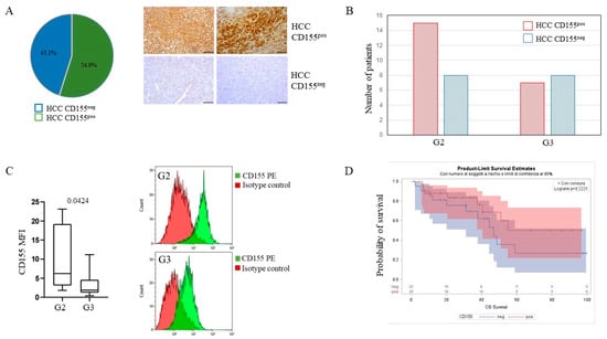 CD155 expression on tumor tissues. (A) Distribution of CD155pos and CD155neg HCC specimens and representative images of immunohistochemical analysis (n = 51). Representative images of CD155 positive (upper row) and negative (lower row) expressions in HCC tumor tissues at 10X magnification, bars: 100 μm. (B) Distribution of the same CD155pos and CD155neg HCC patients stratified according to tumor grading (moderate and poorly differentiated, G2 and G3 respectively). (C) Expression of CD155 in HCC primary cells from G2 (n = 7) and G3 tumors (n = 10) evaluated by flow cytometry (MFI, calculated as CD155 MFI-isotype control MFI). Representative histograms of CD155 expression in HCC primary cells derived from a G2 and a G3 tissue. (D) Overall survival of HCC patients according to CD155 expression.