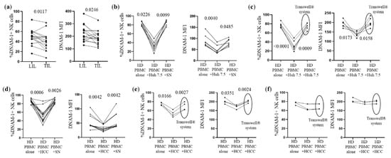 We also evaluated the effect of the siRNA-CD155 transfection in the primary HCC cell line and found that siRNA reduced CD155 expression (Figure S5e). This resulted in an increased frequency of DNAM-1+ NK cells (Figure 4c and Supplementary Materials Figure S8c), as well as a higher DNAM-1 expression (Figure 4d and Supplementary Materials Figure S8d).