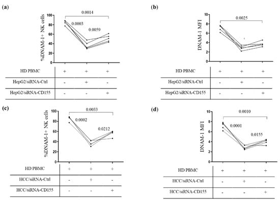 CD155-induced DNAM-1 downregulation was also confirmed by siRNA-mediated knockdown. Surface CD155 expression was evaluated in the HepG2 cell line after transfection with CD155 siRNA or the negative control. siRNA-mediated knockdown of CD155 reduced CD155 expression in HepG2 cells (Figure S5d). After exposure of PBMCs from HDs to siRNA-CD155 HepG2 cells, the frequency of DNAM-1+ NK cells (Figure 4a and Supplementary Materials Figure S8a) and the expression of DNAM-1 (Figure 4b and Supplementary Materials Figure S8b) were both significantly increased compared to the siRNA-negative control.