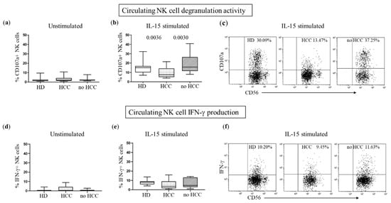 Decreased DNAM-1-mediated cytotoxicity in circulating NK cells. A reverse antibody-dependent cytotoxicity (rADCC) assay was used to test DNAM-1 receptor-mediated NK cell functions. Degranulation activity (%CD107a+ NK cells) of circulating NK cells from 11 HDs, 20 HCC subjects, and 11 no HCC subjects was analyzed before (a) and after (b) IL-15 stimulation. (d,e) IFN-γ production was tested in NK cells from 11 HD, 15 HCC subjects, and 11 no HCC subjects, under the same experimental conditions. Middle bars represent median values, box plots are 25% and 75% percentiles, whiskers are minimum and maximum values. The non-parametric Kruskal–Wallis test was used to compare data. Representative dot plots of degranulation (c) and IFN-γ production (f) of stimulated NK cells from HDs, HCC subjects, and no HCC subjects are also shown.