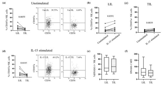 TIL-NK cell cytotoxic activity was significantly reduced compared with matched LIL NK cells (Figure 6a). After treatment with IL-15, significantly increased NK cell degranulation was observed in both NK-LIL and NK-TIL compartments (Figure 6b,c). However, the NK-TIL cytotoxic potential remained significantly lower than that of NK-LIL (Figure 6d), despite IL-15 stimulation having restored the DNAM-1 expression in NK-TIL (Figure 6e,f).