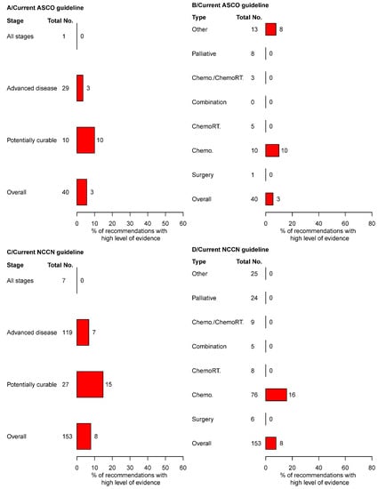 Regarding disease stage, proportions of recommendations based on high LOE for “potentially curable disease” ranged from 10% (1/10) to 15% (4/27) between both guidelines (Table 1 and Figure 2A,C). Proportions of recommendations based on high LOE for “advanced disease” ranged from 3% (1/29) to 7% (8/119).