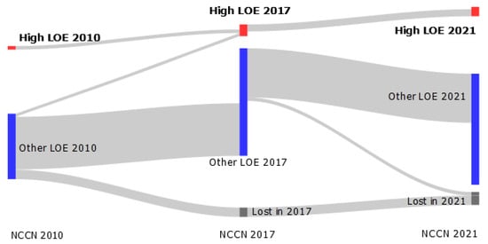 Evolution of evidence at the recommendation level in current and prior NCCN guidelines. LOE: level of evidence. “Lost in”: some recommendations were not repeated in newest versions of NCCN guidelines; “Other LOE” represents all other levels of evidence (see Section 2).