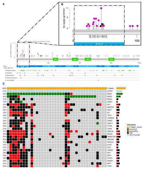 - Gao, C.; Wang, Y.; Broaddus, R.; Sun, L.; Xue, F.; Zhang, W. Exon 3 mutations of CTNNB1 drive tumorigenesis: A review. Oncotarget 2017, 9, 5492. [Google Scholar] [CrossRef] [PubMed] [Green Version]