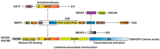 As shown in Figure 1, BRPF1 has a yeast transcription factor Sfp1-like C2H2 zinc finger (SZ), nuclear localization signal 1 (NLS1) and the BRPF-specific N-terminal (BN) at the N-terminus, enhancer of polycomb (EPC)-like motif 1 (EPC-I), PHD-zinc knuckle-PHD (PZP) domain, NLS2, EPC-II and bromodomain in the middle part and Pro-Trp-Trp-Pro (PWWP) domain at the C-terminus. EPC-I, together with the BN domain, are required for association with the MYST (named for members MOZ, Ybf2/Sas3, Sas2 and Tip60) domain of KAT6A or KAT6B, whereas EPC-II is sufficient for interaction with ING5 or ING4 and MEAF6. Thus, BRPF1 is a scaffold protein that bridges KAT6A/KAT6B and two accessory proteins (ING4/5 and MEAF6) [14,15,16,17]. There are also three histone-binding modules existing in BRPF1, including a PZP domain, a bromodomain, and a PWWP domain. The PZP domain recognizes unmodified histone H3 tails and associates with DNA [18,19,20], the bromodomain is capable of binding to acetyllysine in histone H4 and H3 (H4/H3KAc) [21,22,23,24], and the PWWP domain is necessary for the association of BRPF1 with condensed chromatin and recognizes trimethylated K36 of histone H3 (H3K36me3) [25,26]. BRPF1 has a specific domain SZ that BRD1 and BRPF3 do not have [13,27,28,29,30]. These domains of BRPF1, together with other chromatin reader domains from other subunits of the complex, facilitate the recruitment of KAT6A/KAT6B to different sites of active chromatin [24]. Analogously, KAT7 participates in forming a KAT7-BRPF1 tetrameric complex and acetylates only histone H3 on chromatin, while the previously reported KAT7-JADE complex targets histone H4 [12].