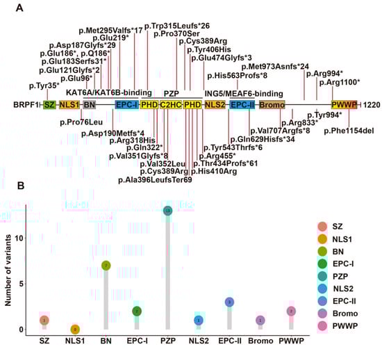 Syndromic intellectual disability-associated BRPF1 germline variants. (A) Illustration of the BRPF1 variants identified in the 43 cases identified to date. A BRPF1 Tyr406His variant was identified in an autistic individual, but the pathogenicity remains elusive. See Figure 1 for domain nomenclature. (B) Lollipop graph demonstrating the distribution of syndromic intellectual disability-associated BRPF1 variants in different domains. Most variations are clustered in PZP domain.