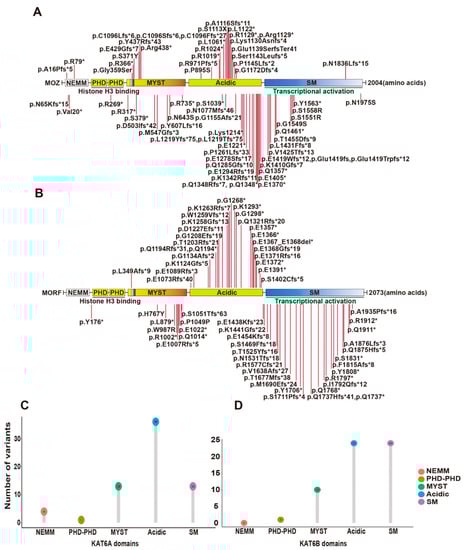 KAT6A and KAT6B were originally identified as genes rearranged in leukemia [17,31]. Later, they were also reported to be mutated in patients with intellectual disability and neurodevelopmental disorders [36,37,118,119,120,121,122,123,124]. A recent study summarized 61 KAT6A variants from 76 patients [123]. Syndromes of 100% penetrance include intellectual disability and speech delay. The protein domains of KAT6A include a NEMM domain (aa 1-206), two PHD domains (aa 207-313), an MYST domain (aa 314-787), an acidic domain (aa 788-1414) and a Ser/Met domain (aa 1414-2004) (Figure 3A). The 61 variants were located spanning all domains (Figure 3A,C). Individuals with truncating mutations located in exons 16–17 of KAT6A showed more prevalent and severe ID.