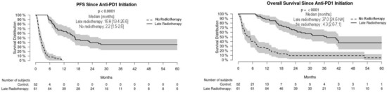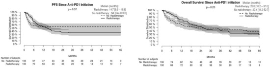 The absence of a statistically significant difference in PFS and OS between radiated and non-radiated patients in the whole population despite similar characteristics at inclusion for most prognostic criteria (Table 1) can be explained by our indications of RT, which required initial life-threatening or symptomatic metastases (39% of radiated patients), later anti-PD-1 initial monotherapy failure (53%), or a combination of both situations (8%), leading to a poorer prognosis in the radiated population. This reinforces the value of our findings.