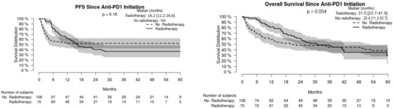 The following supporting information can be downloaded at: https://www.mdpi.com/article/10.3390/cancers14174069/s1, File S1: Study protocol [36,37,38,39,40,41,42,43,44,45,46,47,48,49,50,51]; File S2: PFS and OS curves from date of RT in radiated patients.