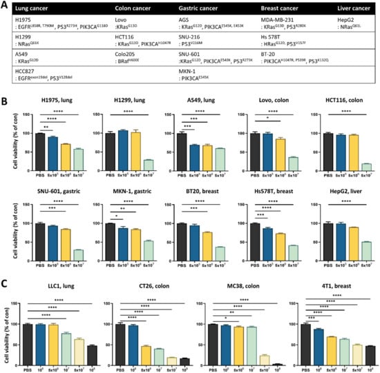 Human lung (H1975, H1299, A549, and HCC827), colon (LoVo and HCT116), gastric (SNU-601, MKN-1, SNU-216, and AGS), breast (MDA-MB-231, Hs578T, and BT20), and liver (HepG2) cancer cell lines were purchased from the Korean Cell Line Bank (Jongno-gu, Seoul, Korea). Mouse lung (LLC1), colon (CT26 and MC38), and breast (4T1) cancer cells were purchased from the American Type Culture Collection (Manassas, VA, USA) and Kerafast (Winston-Salem, NC, USA). All cells were free from mycoplasma contamination. All human cell lines were cultured in Roswell Park Memorial Institute medium (RPMI, GIBCO) and all mouse cell lines were cultured in Dulbecco’s modified eagle medium (DMEM, GIBCO). Each medium was supplemented with 10% fetal bovine serum (FBS, GIBCO), 100 units/mL penicillin (GIBCO), and streptomycin (GIBCO). All cells were maintained in a 5% CO2 humidified incubator at 37 °C.
