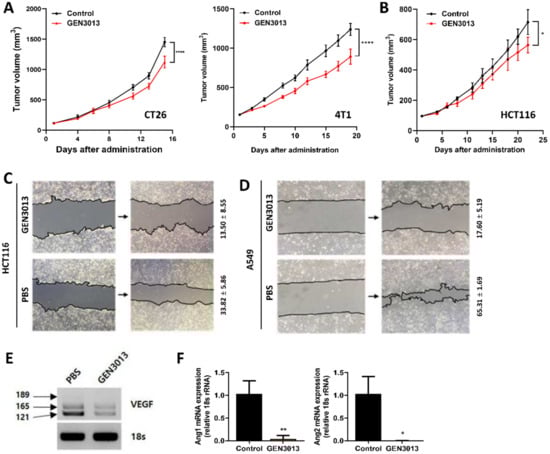 Lactococcus lactis GEN3013 treatment prevents tumor growth through direct effects on cancer cells. (A) Nude mice were inoculated with mouse cancer cell lines, CT26 (N = 7 per group) and 4T1 (N = 10 per group), respectively, 14 days after the initial oral administration of L. lactis GEN3013. While L. lactis GEN3013 was orally administered daily to mice, the tumor growth was measured three times a week. L. lactis GEN3013 versus control: CT26, p ≤ 0.0001; 4T1, p ≤ 0.0001. (B) Nude mice were inoculated with HCT116 human cancer cells (N = 5 per group). L. lactis GEN3013 versus control: p = 0.0239. (C,D) The mobility of HCT116 cells or A549 cells was measured using a wound-healing assay and calculated relative to the status of the zero time point of cell damage. (C) L. lactis GEN3013 treatment, 13.50% ± 8.55%; PBS treatment, 33.82% ± 5.86%. (D) L. lactis GEN3013 treatment, 17.60% ± 5.19%; PBS treatment, 65.31% ± 1.69%. (E) VEGF expression in HCT116 cells was analyzed using a western blot. The levels of VEGF isoforms, including the 121, 165, and 189 isoforms, were detected. (F) The Ang1 and Ang2 mRNA expression was measured using quantitative PCR. L. lactis GEN3013-treated versus untreated: Ang1, p = 0.0047; Ang2, p = 0.0136. For all graphs, data are shown as the mean ± SEM and p-values are represented as * p ≤ 0.05, ** p ≤ 0.01, and **** p ≤ 0.0001. Statistical significance was determined using two-way ANOVA with Tukey’s test for multiple comparisons (A,B), or a two-sided unpaired t-test (F).