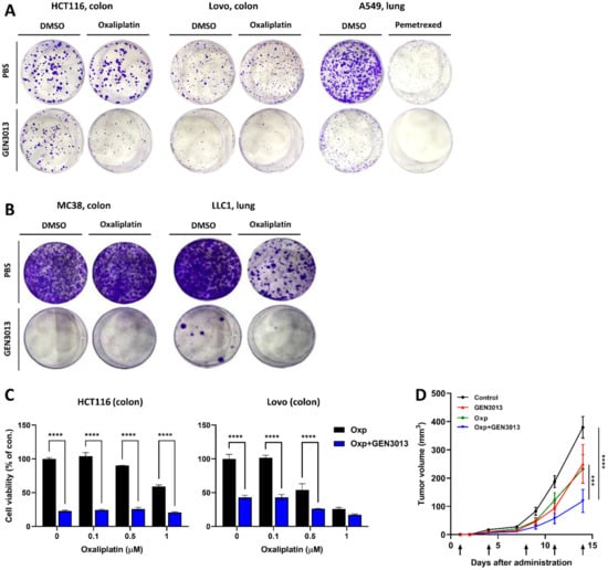 Oxaliplatin and pemetrexed have been approved by the US Food and Drug Administration as colorectal and lung cancer medication, respectively. Despite their effectiveness in treating both naïve and relapsed advanced cancer, a narrow therapeutic index limits their use; therefore, the development of combinatorial agents that can either enhance their efficacy or reduce the dose-limiting toxicity is needed. We tested whether the therapeutic effects of oxaliplatin or pemetrexed were enhanced by combination treatment with L. lactis GEN3013. The proliferation of human cancer cell lines (HCT116, colon; LoVo, colon; A549, lung) and murine cancer cell lines (MC38, colon; LLC1, lung) was inhibited by a single treatment with L. lactis GEN3013 and oxaliplatin or pemetrexed (Figure 3A,B). Moreover, a remarkable inhibitory effect was observed in the cancer cells treated with L. lactis GEN3013 and the anticancer drugs compared to the effect in those treated only with L. lactis GEN3013 or the anticancer drugs (Figure 3A,B). In the case of oxaliplatin, the dose limitation was overcome by co-treatment with L. lactis GEN3013 because it enhanced the cancer-killing effect at all concentrations in HCT116 and LoVo human colon cancer cells (Figure 3C). The combined effect of L. lactis GEN3013 and oxaliplatin was validated in a syngeneic mouse model. After prevention treatment with L. lactis GEN3013 for two weeks, the mice were subcutaneously inoculated with MC38 cancer cells. Then, the mice were orally administered L. lactis GEN3013 daily, and oxaliplatin was intra-peritoneally injected twice a week. The results showed that the anticancer effect of the L. lactis GEN3013 treatment alone was similar to that of the oxaliplatin treatment alone, and a synergetic effect occurred for the treatment with both L. lactis GEN3013 and oxaliplatin (Figure 3D).