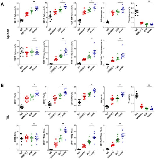 Combination of Lactococcus lactis GEN3013 and chemotherapy reprograms the host immune system. (A,B) Changes in the immune cell population of the spleen (A) or the tumor microenvironment (B) were measured via immune cell profiling after the administration of L. lactis GEN3013, oxaliplatin, or their combination (N = 8 per each group). Oxaliplatin versus combination in the spleen tissues: CD4+ T cells, p = 0.0075; CD8+ T cells, p = 0.0238; effector CD8+ T cells, p = 0.0213; NK cells, p = 0.0455; Tregs, ns; CD45+ cells, ns; CD4+ T cells/Tregs ratio, p = 0.007; CD8+ T cells/Tregs ratio, p = 0.0069; effector CD8+ T cells/Tregs ratio, ns. Oxaliplatin versus combination in the tumor tissues: CD4+ T cells, p = 0.012; CD8+ T cells, p = 0.0155; effector CD8+ T cells, p = 0.0386; NK cells, p = 0.0022; Tregs, ns; CD45+ cells, ns; CD4+ T cells/Tregs ratio, p = 0.0087; CD8+ T cells/Tregs ratio, p = 0.0058; effector CD8+ T cells/Tregs ratio, p = 0.0085. For all graphs, data are shown as the mean ± SEM and p-values are represented as * p ≤ 0.05, ** p ≤ 0.01, and ns (not significant). The statistical significance was determined using one-way ANOVA and Tukey’s test for multiple comparisons.