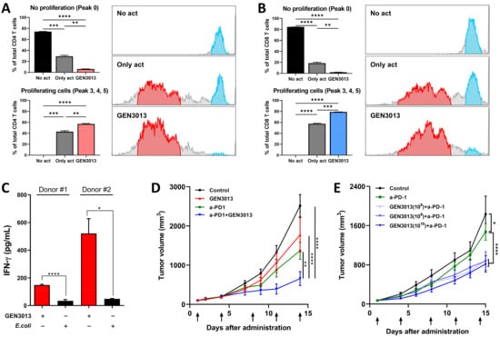 Lactococcus lactis GEN3013 enhances the therapeutic effects of immunotherapy. (A,B) Mouse T cell proliferation was measured using CFSE staining and flow cytometry. Blue population (right panel) represents no proliferative cells (peak 0), while the red population indicates actively proliferative cells (peaks 3, 4, and 5). The p-values for the peak 0 population in CD4+ T cells (p = 0.0002, p ≤ 0.0001, p = 0.0019), the peak 3, 4, and 5 populations in CD4+ T cells (p = 0.0003, p ≤ 0.0001, p = 0.0073), the peak 0 population in CD8+ T cells (p ≤ 0.0001, p ≤ 0.0001, p = 0.0033), and the peak 3, 4, and 5 populations in CD8+ T cells (p ≤ 0.0001, p ≤ 0.0001, p = 0.0004) were in the following order: no act versus only act, no act versus L. lactis GEN3013, and only act versus L. lactis GEN3013. (C) Human T cell activation was observed via ELISA of IFN-γ. E. coli versus L. lactis GEN3013: donor #1, p = 0.0001; donor #2, p = 0.0105. (D) C57BL/6 mice were inoculated with MC38 mouse cancer cells (N = 6 per group) 14 days after the initial oral administration of L. lactis GEN3013. L. lactis GEN3013 was orally administered daily, whereas the PD-1 blockade was intraperitoneally injected at 1, 4, 8, 11, and 14 days after tumor inoculation. Control versus PD-1 blockade, p ≤ 0.0001; control versus L. lactis GEN3013, p = 0.0019; control versus PD-1 blockade + L. lactis GEN3013, p ≤ 0.0001; PD-1 blockade versus PD-1 blockade + L. lactis GEN3013, p = 0.0051; L. lactis GEN3013 versus PD-1 blockade + L. lactis GEN3013, p ≤ 0.0001; PD-1 blockade versus L. lactis GEN3013, ns. (E) L. lactis GEN3013 was orally administered dose-dependently at 108, 109, and 1010 CFUs (N = 7 per group). Control versus PD-1 blockade, p = 0.0318; control versus L. lactis GEN3013 (all concentrations), p ≤ 0.0001; PD-1 blockade versus PD-1 blockade + L. lactis GEN3013 (all concentrations), p ≤ 0.0001. For all graphs, data are shown as the mean ± SEM and p-values are represented as * p ≤ 0.05, ** p ≤ 0.01, *** p ≤ 0.001, and **** p ≤ 0.0001. Statistical significance was determined using one-way (A,B) or two-way (D,E) ANOVA with Tukey’s test for multiple comparisons, or an unpaired t-test (C).