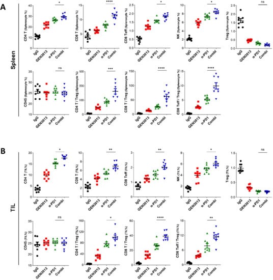 Combination of Lactococcus lactis GEN3013 and immunotherapy reprograms the host immune system. (A,B) Changes in the immune cell population of the spleen (A) or the tumor microenvironment (B) were measured via immune cell profiling after the administration of L. lactis GEN3013, the PD-1 blockade, or their combination (N = 8 per each group). PD-1 blockade versus combination in the spleen tissues: CD4+ T cells, p = 0.0419; CD8+ T cells, p ≤ 0.0001; effector CD8+ T cells, p = 0.0257; NK cells, p = 0.0182; Tregs, ns; CD45+ cells, ns; CD4+ T cells/Tregs ratio, p ≤ 0.0001; CD8+ T cells/Tregs ratio, p ≤ 0.0001; effector CD8+ T cells/Tregs ratio, p ≤ 0.0001. PD-1 blockade versus combination in tumor tissues: CD4+ T cells, p = 0.019; CD8+ T cells, p = 0.0014; effector CD8+ T cells, p = 0.0031; NK cells, p = 0.0408; Tregs, ns; CD45+ cells, ns; CD4+ T cells/Tregs ratio, p = 0.021; CD8+ T cells/Tregs ratio, p ≤ 0.0001; effector CD8+ T cells/Tregs ratio, p = 0.0045. For all graphs, data are shown as the mean ± SEM and p-values are represented as * p ≤ 0.05, ** p ≤ 0.01, *** p ≤ 0.001, **** p ≤ 0.0001, and ns (not significant). Statistical significance was determined using one-way ANOVA with Tukey’s test for multiple comparisons.
