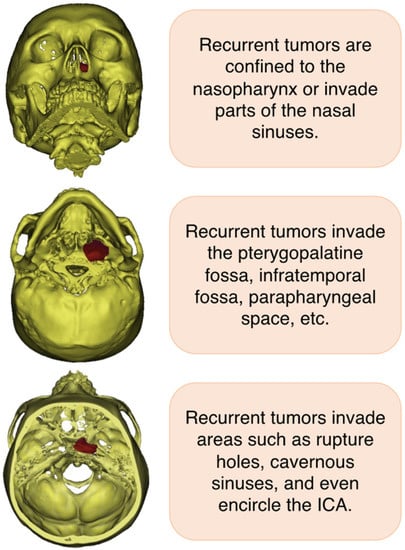 The common clinical manifestation of recurrent NPC is blood accumulation in the nose or sputum, which is different from primary NPC, where the most common clinical symptom is neck swelling, while ear symptoms and headache are also more common [1,21]. In the case of recurrent NPC, it is not uncommon to have corresponding dysfunction of cranial nerves, muscles or adjacent organs of the nasopharynx after they have been invaded by the tumor [2,22]. Patients with cervical lymph node metastasis at the time of the first diagnosis are more likely to have a recurrence with a neck mass [6,9]. The 8th edition of the Union for International Cancer Control (UICC) and the American Joint Committee on Cancer (AJCC) TNM staging criteria for NPC are used as the latest standards for diagnosis in the clinic [23,24]. In contrast, the 6th or 7th edition of the TNM staging criteria for NPC is more commonly used by researchers in previous publications [6,7,9,25,26,27]. The 6th or 7th edition staging may be more applicable to recurrent NPC. According to these editions, NPC is characterized using the following stages: 1. rT1—tumor is confined to the nasopharynx; 2. rT2—tumor has invaded the nasal cavity, sinuses, parapharyngeal space, and/or adjacent soft tissues (internal pterygoid muscle, medial pterygoid muscle, etc.); 3. rT3—tumor has invaded the base wall of the pterygoid sinus; 4. rT4 tumor has invaded the intracranial structures, internal carotid artery, cranial nerves, orbit, parotid gland, external pterygoid muscle, and other adjacent tissues in a larger area. Figure 1 shows the common sites of tumor involvement in recurrent NPC. The gold standard for the diagnosis of recurrent NPC is pathological diagnosis [28,29]. Compared with primary NPC, the difference is that the main body of the lesion is not in the nasopharynx or nasal cavity, which are convenient for biopsy, but in the parapharyngeal space or adjacent muscular tissues or even in the intracranial area, where the traditional transnasal biopsy is not so applicable. Therefore, in the diagnosis of recurrent NPC, imaging has a higher impact. The most commonly used imaging techniques to evaluate the lesion before treatment are: high-resolution computed tomography (HRCT) of the nasopharynx and skull base, enhanced magnetic resonance imaging (MRI) of the nasopharynx and skull base, and positron emission tomography CT (PET-CT) of the whole body.
