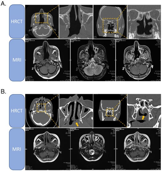 (A) HRCT and MRI images of bone necrosis in recurrent NPC patients. (B) HRCT and MRI images of soft tissue necrosis in recurrent NPC patients. An “air bubble shadow” can be seen in the soft tissue shadow on CT.