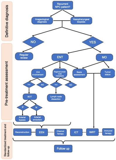 Flowchart for the diagnosis and treatment of recurrent NPC with post-treatment management. ENT, ear nose and throat; MO, medical oncology; ICA, internal carotid artery; BOT, balloon occlusion test; P, positive; N, negative; EEN, endoscopic endonasal nasopharyngectomy; ICT, induction chemotherapy; IMRT, intensity-modulated radiation therapy.