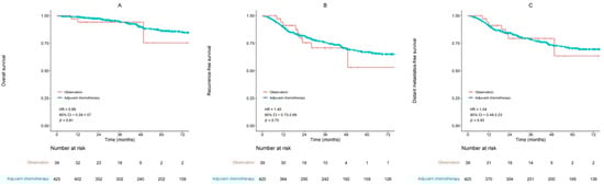Survival curves in high-risk group. (A) Overall survival (B) Recurrence-free survival (C) Distant metastasis-free survival (HR, hazard ratio; CI, confidence interval).