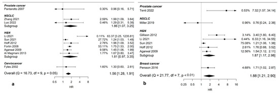 Ten studies (13,276 patients) presented data on smoking during radiation therapy and the risk of LRR. The pooled HR was 1.56 (95% CI: 1.28–1.91; Figure 2a), showing an increased risk of LRR in smokers compared to non-smokers during radiation therapy.