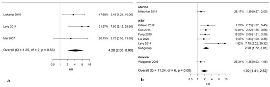 Three studies (339 patients; 68 with anal cancer, 271 with head and neck cancer) presented data on the risk of LRR in smokers during chemoradiotherapy compared to non-smokers. Smoking was associated with an increased risk of LRR (pooled HR: 4.28; 95% CI: 2.06–8.90; Figure 3a).