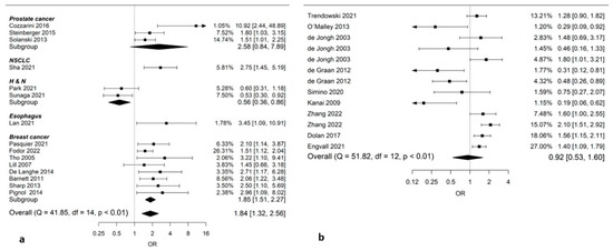 Fifteen studies (6776 patients) included data on radiation-induced toxicity (regardless of toxicity) in smokers during radiation therapy compared to non-smokers. Smoking during radiation therapy led to an increased risk of radiation-induced toxicity with an OR of 1.84 (95% CI: 1.32–2.56; Figure 4a).