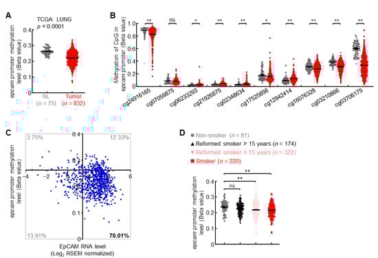 3.3. Promoter Hypomethylation Induces EpCAM Expression in Primary Lung Cancer