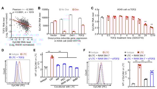 3.6. Macrophage-Derived TGFβ Represses EpCAM Expression in Lung Cancer Cells