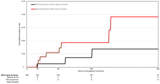 Patients with cancer are at increased risk of venous thromboembolism (VTE), and VTE appearing in patients with cancer implies an increased risk of VTE recurrences, bleeding, and mortality [,,,]. Current guidelines on antithrombotic therapy, based on the results of randomized clinical trials, provide recommendations that apply to patients with all types of cancers [,,]. However, cancer is a widely heterogeneous disease, and the risk of recurrences, bleeding, or death may differ according to the cancer site or other variables [,,]. Several patient-, disease-, or treatment-related factors may account for these differences, including the initial VTE presentation, different cancer therapies, the presence of metastases, or the use of central venous catheters [], but the association between the cancer histology and outcome after a VTE event has not been consistently evaluated thus far.