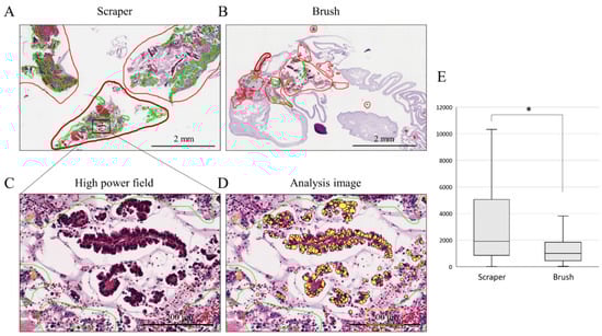 Epithelial cell count analysis on cell block sections. (A,B): histological findings of scraper group (A) and brush group (B) in low-power field. The areas with epithelial components are circled in red. The areas circled by the green line were excluded due to the presence of necrotic tissue and inflammatory cells. (C,D): histological findings in high-power field (C) and analysis image of Aperio CS2 (D). Yellow-colored nuclei; only the nuclei of the epithelial component were measured. (E): comparison of the median numbers of cells obtained by each device; *, p < 0.05.