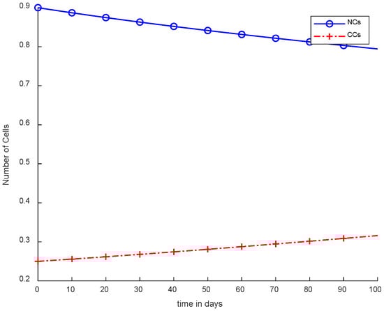 The first case describes the growth rate of NCs and CCs. Therefore, Equations (17) and (18) explain the mentioned concept. There is no practice involved, such as immunotherapy, chemotherapy, and controllers.