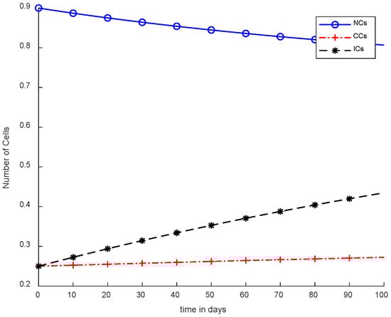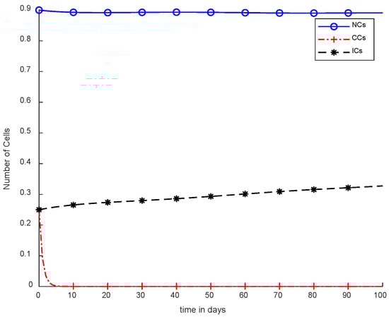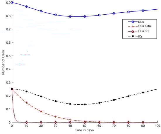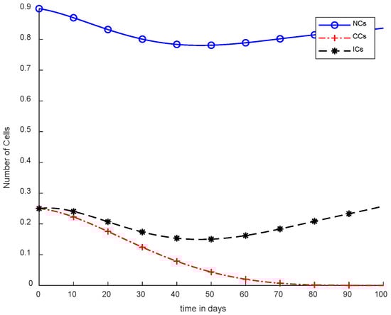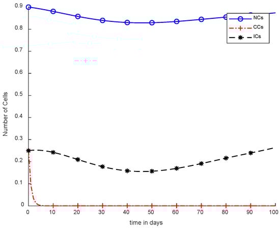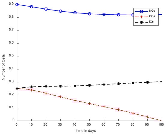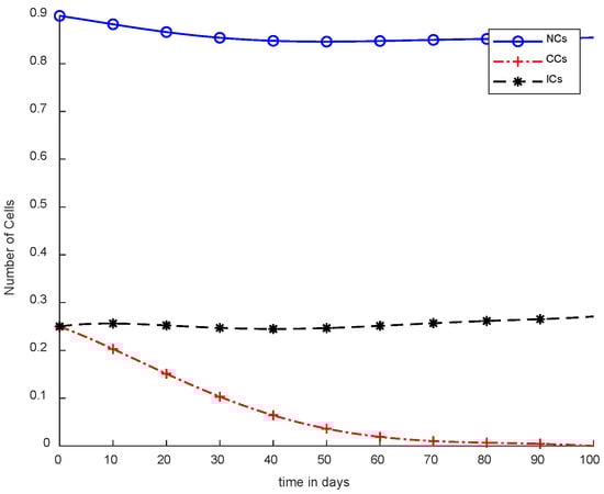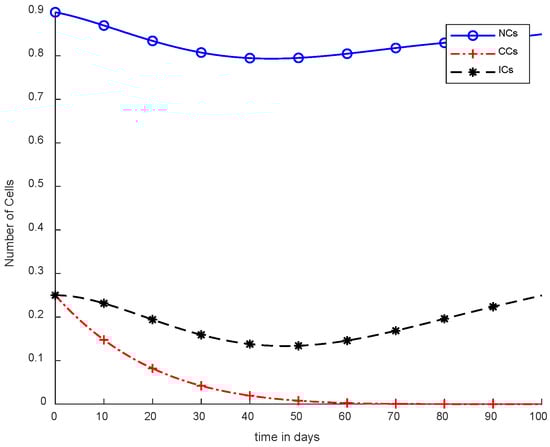 The mentioned model describes the metrics of cancer with NCs and ICs. However, and are denoted as NCs, CCs,, and ICs respectively. Furthermore, in Equation (4),is used for chemotherapy treatment, while the remaining model parameters include, , and coefficients of cell death rate. In addition, and drugs carry capacities such as to. Moreover, and are considered natural death rates, and and are the growth rates for ICs and drugs, respectively. is the response rate, and the threshold rate can be symbolized as s [6]. The simulation results utilize chemotherapy drugs, and the maximum effect on body cells are observed within 100 days. The obtained results will not reduce the level of NCs, which is .