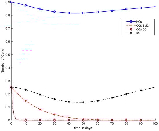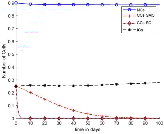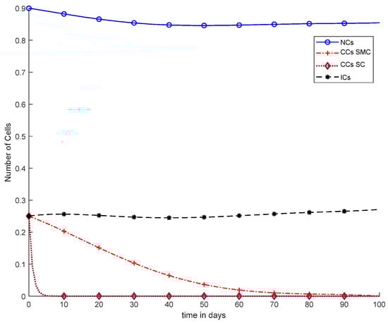 As we know, CCs directly affect the process of immunotherapy. However, we added chemotherapy, which tries to reduce CCs. There is no such controller utilized in Equations (22)–(24). However, the main problem is that using only immunotherapy and chemotherapy does not reduce CCs individually. When chemotherapy and immunotherapy are used together, the CCs are reduced. Moreover, chemotherapy disturbs NCs with cancer and also has an effect on ICs.