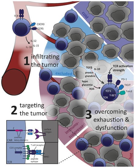 Major challenges for adoptively transferred T cells in the tumor microenvironment. The immune infiltration of a solid tumor is schematically represented by a cold (dark blue), an excluded (light blue), an immunosuppressed (violet), and a hot (red) tumor sector with gradually more CD8+ T cells (shown as blue cells) penetrating the tumor tissue (represented by grey tumor cells). Three major challenges are depicted, along with relevant exemplary adjustment screws, as discussed in this review: infiltrating the tumor (1), targeting the tumor via CARs or TCRs (both illustrated schematically) (2), and overcoming exhaustion and dysfunction (3).