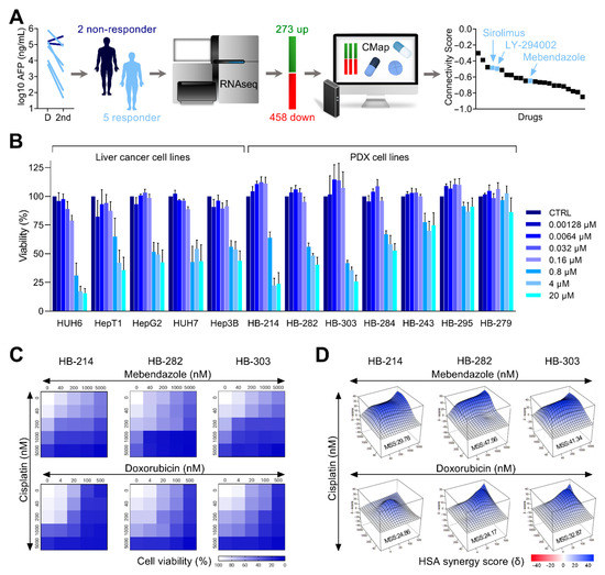 Repurposing of mebendazole for chemoresistant hepatoblastoma. (A) Alpha-fetoprotein (AFP) levels in the serum of patients were measured at diagnosis (D) and after the second cycle of chemotherapy (2nd) and are given as log10 ng/mL. Responsiveness to chemotherapy was considered as a decline in AFP level log10 ≥ 1. RNA sequencing data from the 2 non-responders and the 5 responders were retrieved from the Gene Expression Omnibus and differentially expressed genes integrated into Connectivity Map (CMap). The graph shows candidate drugs predicted by CMap with a negative connectivity score indicative of a potential therapeutic value. (B) MTT-based viability assays displaying the response of 5 liver cancer cell lines and 7 PDX cell lines towards mebendazole exposure with 7 increasing concentrations ranging from 0.00128–20 µM. Error bars represent standard error of the mean (±SEM) of three independent experiments, each consisting of two replicates. (C) Heatmaps displaying the proportions of cell viability upon exposure towards increasing concentrations (given in nM) of cisplatin, mebendazole, and doxorubicin in a two-drug combination matrix format (n = 2, duplicates). (D) Three-dimensional synergy landscapes shown separately for each two-drug combination of cisplatin, mebendazole, and doxorubicin, as calculated from cell viability assays (n = 2, duplicates). Maximum synergy scores (MSS) were calculated via Synergyfinder2.0 software with the HSA model.