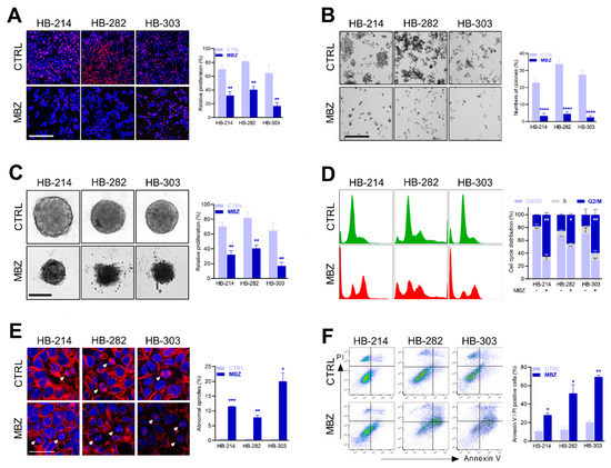 Mebendazole hinders short and long-term cell growth due to cell cycle arrest. (A) Proliferating cells were detected by EdU-staining (red) and quantified in relation to Hoechst 33342-stained nuclei (blue). HB-214, HB-282, and HB-303 cells were exposed to DMSO (CTRL) or mebendazole (MBZ) in a concentration of 2 μM, 4 μM, and 2 μM, respectively. The graph represents the mean of 3 experiments. Scale bar represents 300 μm. (B) Long-term growth of the PDX cells was detected by colony formation assay. Cells were exposed to DMSO or 0.5 μM mebendazole for 7 days, and colonies were stained with crystal violet. The graph represents the mean of 3 experiments. Scale bar represents 750 μm. (C) The capacity of PDX cells forming three-dimensional tumor spheroids was monitored on day 4 after exposure to 2 μM, 4 μM, and 2 μM mebendazole. The graph represents the mean spheroid volumes of 3 experiments. Scale bar represents 300 μm. (D) Distributions of cell cycle phases were determined on Hoechst 33342-stained cells treated with 2 μM, 1 μM, and 2 μM mebendazole for 48 h by flow cytometry acquisition. The graph represents the mean of 2 independent experiments analyzed by FlowJo. (E) Mitotic spindles were detected by alpha-tubulin (TUBA) staining (red) in Hoechst 33342-counterstained nuclei (blue) of mebendazole exposed cells (24 h; 2 μM, 4 μM, and 2 μM). The arrows indicate normal spindles in the CTRL group and abnormal spindles in the MBZ group. The graph displays the mean of 2 independent experiments. Scale bar represents 50 µm. (F) Apoptosis was detected by Annexin V/propidium iodide double-stain via flow cytometry in MBZ exposed cells (48 h; 2 μM, 4 μM, and 2 μM). The graph represents the mean of 2 independent experiments. For all experiments in (A–F), error bars represent standard deviation (±SD), p-values were calculated using a two-tailed unpaired Student’s t test and significance determined as follows: ns, not significant; * p < 0.05; ** p < 0.01; *** p < 0.001, **** p< 0.0001.