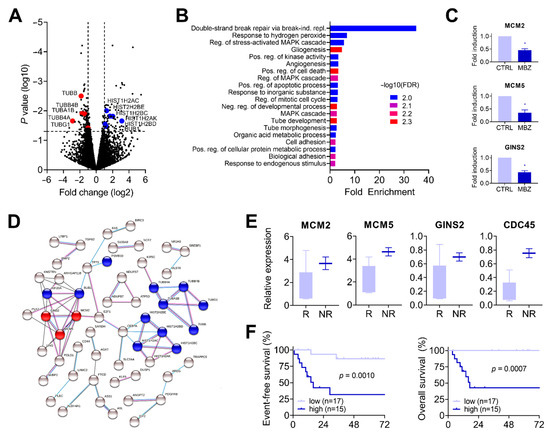 In order to identify other biological processes apart from the spindle/chromosome-associated cell division that relate to mebendazole treatment, we applied gene ontology (GO) enrichment and protein–protein interaction network analysis to the differentially expressed genes detected by RNA sequencing (Figure 3B,C). In agreement with the previous in vitro findings, we detected cell cycle (GO:0007346) and apoptosis (GO:0010942 and GO:0043065) related gene enrichment within the top 20 ranking categories (Figure 3B, Supplementary Table S4). GO enrichment analysis revealed the GO term “double-strand break repair via break-induced replication” (GO:0000727) as the highest scoring category by far, containing the genes of the minichromosome maintenance complex components 2 and 5 (MCM2, MCM5) and the GINS complex subunit 2 (GINS2). Further analysis of the RNA sequencing data from the treatment experiments clearly highlighted that these genes were strongly downregulated in all three PDX lines upon mebendazole treatment (Figure 3C). Interestingly, GINS2 and CDC45 proteins together with other MCM subunits build up the so-called unwindosome, which assembles during cell cycling in order to unwind duplex DNA during DNA replication [40]. The creation of a protein–protein interaction network of candidate genes underscored the functional relationship between unwindosome components and spindle/chromosome-associated cell division (Figure 3D).