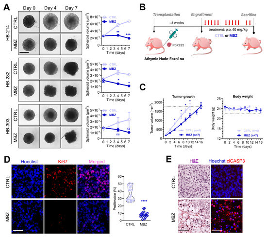 Mebendazole testing in patient-near spheroid and xenograft models. (A) Established tumor spheroids of HB-214, HB-282, and HB-303 cells were treated with vehicle (CTRL) or mebendazole (MBZ) at concentrations of 2 μM, 4 μM, and 2 μM for 0, 4, and 7 days. The graph represents mean spheroid volumes of one experiment consisting of triplicate measurements. Scale bars represent 300 μm, error bars represent ± SD. p-values were calculated using a two-tailed unpaired Student’s t test. (B) Experimental overview of mebendazole testing in vivo. Immunocompromised mice bearing subcutaneously transplanted HB-282 tumors were treated with 40 mg/kg body weight mebendazole (MBZ) by oral administration or vehicle (CTRL) 5 times per week. Mice were sacrificed on the day that they reached the maximal tolerable tumor size of 1,764 mm3. (C) Tumor growth (left panel) and body weight changes (right panel) in mice treated with either MBZ (n = 7) or vehicle (n = 6). Values correspond to mean tumor volumes and mean body weights ± SEM. Dashed lines indicate maximum permissible values. (D) Immunofluorescent staining of Ki67 positive nuclei (red) counterstained with Hoechst 33342 (blue) of vehicle (CTRL) and mebendazole (MBZ) treated tumors. Scale bars represent 50 µm. Proliferation was calculated by relating Ki67 positive nuclei of six representative areas of three tumors per condition to Hoechst 33342 nuclei. (E) Hematoxylin/eosin (H&E) staining of vehicle (CTRL) and mebendazole (MBZ)-treated tumors (left panel) and immunofluorescent staining of cleaved caspase-3 (clCASP3; red) indicating apoptotic regions counterstained with Hoechst 33342 (right panel). Scale bars represent 50 µm. Significance is given as follows: ns, not significant; * p < 0.05; ** p < 0.01; *** p < 0.001; **** p < 0.0001.