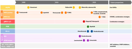 Timeline of main biomarker-based agents approved in metastatic breast cancer. ER, estrogen receptor; PR, progesteron receptor; SERDs, selective estrogen receptor degraders; T-DM1, trastuzumab emtansine; T-DXd, trastuzumab deruxtecan; gBRCA, germaline BRCA; PI3K, phosphoinositide 3-kinase; PD-L1, programmed death-ligand 1; MSI, microsatellite instability; NTRK, Neurotrophic Tyrosine Receptor Kinase; AKT, Alpha-serine/Threonine Kinase; PTEN, Phosphatase and Tensin Homolog; sBRCA, somatic BRCA.
