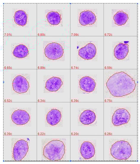 A cohort of liquid-based brush biopsy-based oral preparations was taken from that described by Velleuer et al. [5]. The study was conducted in accordance with the Declaration of Helsinki, and approved by the Western Institutional Review Board of the USA (study number 1139633) and by the ethics committee of the medical faculty of the Heinrich Heine University in Düsseldorf, Germany (study number 4168). Written informed consent was obtained from all participants. Accordingly, our current study consisted of consecutive 92 cytospin preparations from 40 patients between 2016 and 2018 with available follow-up data. The process of visual inspection of the oral cavity, photo-documentation of the suspect lesions (leukoplakias, erythroplakias, mixed lesions, ulcers/erosions), the brushing process, the preparation of liquid-based cytologic samples, and the staining with pararosaniline according to Feulgen were described by Velleuer et al. [5]. A skilled pediatrician (E.V.) performed all oral inspections and took brush biopsies of macroscopically suspicious lesions. Visible ones (leukoplakias or erythroplakias) were sampled and processed as described by Velleuer et al. [5]. Subsequently, DNA-specific staining with pararosaniline according to Feulgen was performed using a staining machine, as described by Velleuer et al., [5]. The EasyScan-AI as described above was used, applying a 40× objective. The total area containing oral cells was scanned per slide. Automated classification of objects was performed into nuclei from normal and abnormal epithelial cells, lymphocytes, granulocytes, nuclear doublets, defocused nuclei, and artefacts. Scanning of the slides was performed by a trained engineer (G.E.) blinded to the follow-up data. After scanning, a cytopathologist (A.B.) checked the results of automated nuclear classifications (especially into nuclei from normal with respect to abnormal epithelial cells) on respective image galleries (Figure 4 and Figure 5). A total of 63 nuclei were, thus, processed per screen. Nuclear doublets, defocused nuclei, and artefacts were removed.
