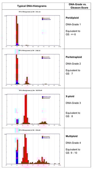 Enzymatic cell separation specimens from needle-biopsies of 80 patients with clinical stage T1a/b and T2a/b prostate cancers, Gleason scores 6 and 7, as described by Böcking et al. (2017) [6], were used. Pararosaniline/Feulgen-stained sedimentation slides were automatically scanned using a MotiCyte-auto (Motic, Xiamen, China). The development of digital nuclear classifiers to specifically identify nuclei from normal fibroblasts for internal reference of the DNA amount, from cancer cells, granulocytes, lymphocytes, and artefacts, was described by [29]. A mean number of 4669 cancer cell nuclei were measured per slide. Internal calibration was performed with nuclei from 268 fibroblasts in the mean. DNA histograms were separated into peridiploid (DNA-grade 1), peritetraploid (DNA-grade 2), x-ploid (DNA-grade 3), and multiploidy (DNA-grade 4) (Figure 2) [18]. Follow-up information was provided by the respective treating urologists.