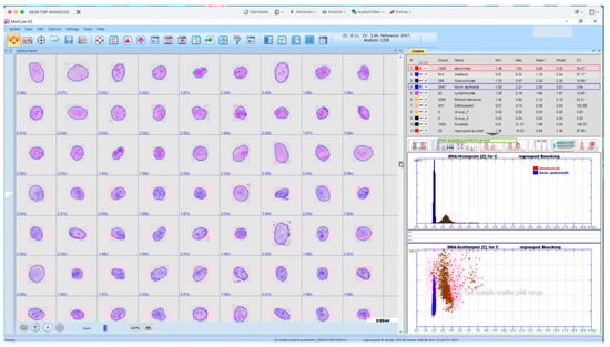 A microscope-based scanner with slide loader with a capacity of up to 10 specimens, a high-resolution color CMOS camera, a multistep autofocus, and AI-based diagnostic software were used. Specimens were stained with pararosaniline, specifically for DNA. In a first step, objects are automatically classified into eight different diagnostic classes (normal and abnormal epithelial or mesothelial nuclei, lymphocytes, granulocytes, lytic nuclei, defocused nuclei, doublets, and artefacts). Internal calibration of DNA content in c-values was performed with morphologically normal epithelial/mesothelial or fibroblast nuclei. In a second step, nuclear DNA was measured with high precision (CV < 4%) in the population of morphologically abnormal nuclei. A specific marker of malignancy was the presence of single-cell aneuploidy (9c exceeding events) or DNA stemline aneuploidy according to standards of the European Society for Analytical Cellular Pathology (ESACP) [24,25]. In the absence of DNA aneuploidy, an increased percentage (>5 or >4%) of morphologically abnormal nuclei were used to raise a suspicion for the presence of cancer cells. The software for diagnostic nuclear classification is based on random forest classifiers and supervised machine learning performed in up to eight rounds of retraining by an experienced cytopathologist (A.B.). An accuracy of >95% for correct classification of different classes of objects in terms of nuclei was achieved. Operators may check the correctness of nuclear classifications on image galleries and that of diagnostic interpretations on DNA histograms.