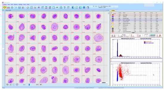 The software used was that of MotiCyte screener (Version no. 2.3, creator David Friedrich, Aachen, Germany) with digital nuclear classifiers [21,22,23,24,25], specified for effusions [4], prostate cancers [6], and oral smears. The classifiers were trained on Feulgen/pararosaniline-stained slides to automatically discriminate normal and abnormal nuclei, lymphocytes, granulocytes, and artefacts (e.g., lytic and defocused nuclei) in oral smears. In effusions, normal and abnormal mesothelial nuclei, those from lymphocytes, granulocytes, and macrophages, and lytic nuclei, defocused nuclei, and doublets were discriminated. In prostate cancers, nuclear preparations from digested tissue, cancerous cells, lymphocytes, granulocytes, fibroblasts, and artefacts were differentiated. Scanning a whole slide took between 40 and 60 min.