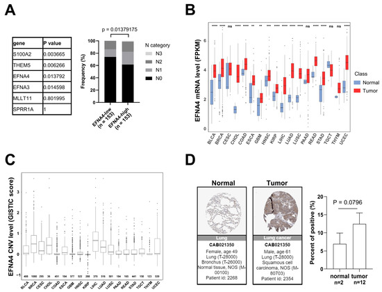 EFNA4 expression and copy number variation (CNV) status in human cancers. (A) The relationship between the expression level of 6 upregulated genes at 1q21.3 and the stage of lymph node metastasis. Gene expression data and related clinical information of patients were obtained from TCGA project. p values were determined using Fisher’s exact test; (B) EFNA4 mRNA level in various types of human tumors compared with normal tissues. Gene expression data were obtained from TCGA project. The box shows median value and 25th and 75th percentiles; (C) EFNA4 copy number values (GISTIC scores) obtained from GISTIC2 software in cancers are shown based on TCGA database. GISTIC2 CNV value 0 means normal copy number. The box shows median value and 25th and 75th percentiles; (D) IHC images of the EFNA4 in LUAD and normal tissues obtained from the HPA database. The positive cells were quantified by ImageJ. p-values are represented as ns (not significant), ** p < 0.01, *** p < 0.001 and **** p < 0.0001.