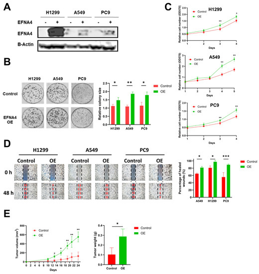 EFNA4 overexpression can promote the proliferation and migration of lung tumor cells. (A) Western blot analysis for EFNA4 in H1299, A549 and PC9 control cells and EFNA4-overexpression (OE) cells that were transfected with EFNA4 expression virus vector; (B) representative images of colony formation of H1299, A549 and PC9 EFNA4-overexpressing cells and control cells. Colonies were stained with methylene blue; (C) MTT cell proliferation assay. H1299, A549 and PC9 control cells and EFNA4-overexpressing cells proliferation was assayed by MTT method. Cell survival rates were analyzed at 1, 2, 3, 4 and 5 days. Data are expressed as mean ± SD of three independent experiments; (D) representative images of scratch wound healing assay of control and EFNA4-overexpressing lung tumor cells; (E) volume and wet weight of xenograft tumors. EFNA4-overexpressing and control A549 cells were subcutaneously implanted in nude mice (n = 3). Data are expressed as mean ± SD of three independent experiments. OE: overexpression. Significant p-values are represented as * p < 0.05, ** p < 0.01 and *** p < 0.001.