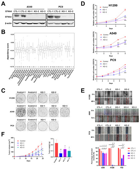 The deletion of EFNA4 can inhibit the growth and migration of lung tumor cells. (A) Western blot confirmation of EFNA4 knockout in A549, PC9 cells; (B) box plot of the DepMap (CRISPR) gene dependency score for EFNA4. Numbers above the X-axis represent respective sample sizes. Lower and upper parts of the box correspond to the 25th and 75th percentiles, respectively; (C) colony formation assay. Representative image of control and EFNA4-KO established colonies (n = 3); (D) MTT cell proliferation assay. A549 and PC9 control cells and EFNA4 knockout cells proliferation was measured by MTT method; (E) cell migration analysis by wound-healing assay in EFNA4 knockout cells and control cells of A549 and PC9 cells; (F) volume and wet weight of xenograft tumors. EFNA4 knockout and control A549 cells were subcutaneously implanted in nude mice (n = 3). Data represented as mean ± SD of three independent experiments. CTL: control; KO: knockout. p-values are represented as ns (not significant), * p < 0.05, ** p < 0.01 and *** p < 0.001.