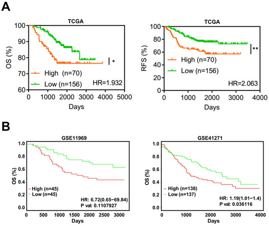EFNA4 expression is correlated with the survival rate in lung cancer patients. (A) Kaplan–Meier curves of overall survival (OS, left) rate and the recurrence survival (RFS, right) rate in TCGA LUAD patients with high EFNA4 expression (n = 70) and low EFNA4 expression (n = 156). (B) Kaplan–Meier overall survival curves of patients with lung tumor in two independent NCBI GEO cohorts (GES11969, GSE41271). Patients are separated into two groups based on EFNA4 mRNA level. Significant p-values are represented as * p < 0.05 and ** p < 0.01.