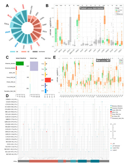 Pan-cancer analysis of miR-944 based on TCGA database. (A) Histogram of median quantile expression of miR-944 in non-tumor and tumor groups in the TCGA database. The blue font indicates that miR-944 is significantly low expressed in this cancer type; the red font indicates that miR-944 is significantly highly expressed in this cancer type; (B) comparison of miR-944 expression levels between non-tumor and tumor groups in the TCGA database. *** means p < 0.0000625; ** means p < 0.000625; * means p < 0.003125; ns means no significant difference; (C) overview of SNVs of TP63; (D) mutation types in TP63 protein domains in various cancers; (E) differences in the expression level of miR-944 between the TP63 mutant group (Mut) and the wild group (WT). Ns means no significant difference. ACC, adrenocortical carcinoma; BLCA, bladder urothelial carcinoma; BRCA, breast invasive carcinoma; CESC, cervical squamous cell carcinoma and endocervical adenocarcinoma; CHOL, cholangiocarcinoma; COAD, colon adenocarcinoma; DLBC, lymphoid neoplasm diffuse large B-cell lymphoma; ESCA, esophageal carcinoma; GBM, glioblastoma; HNSC, head and neck squamous cell carcinoma; KICH, kidney chromophobe; KIRC, kidney renal clear cell carcinoma; KIRP, kidney renal papillary cell carcinoma; LGG, brain lower grade glioma; LIHC, liver hepatocellular carcinoma; LUAD, lung adenocarcinoma; LUSC, lung squamous cell carcinoma; MESO, mesothelioma; OV, ovarian serous cystadenocarcinoma; PAAD, pancreatic adenocarcinoma; PCPG, pheochromocytoma and paraganglioma; PRAD, prostate adenocarcinoma; READ, rectum adenocarcinoma; SARC, sarcoma; STAD, stomach adenocarcinoma; SKCM, skin cutaneous melanoma; TGCT, testicular germ cell tumor; THCA, thyroid carcinoma; THYM, thymoma; UCEC, uterine corpus endometrial carcinoma; UCS, uterine carcinosarcoma; UVM, uveal melanoma.