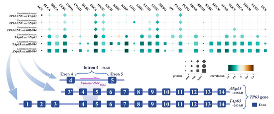 The correlation of miR-944 with TP63 CNV, TAp63, and ΔNp63. The figure indicates the position of hsa-mir-944 in the TP63 gene and shows the correlation of miR-944 with TP63 CNV and the expression of TAp63 and ΔNp63. ACC, adrenocortical carcinoma; BLCA, bladder urothelial carcinoma; BRCA, breast invasive carcinoma; CESC, cervical squamous cell carcinoma and endocervical adenocarcinoma; CHOL, cholangiocarcinoma; COAD, colon adenocarcinoma; DLBC, lymphoid neoplasm diffuse large B-cell lymphoma; ESCA, esophageal carcinoma; HNSC, head and neck squamous cell carcinoma; KICH, kidney chromophobe; KIRC, kidney renal clear cell carcinoma; KIRP, kidney renal papillary cell carcinoma; LGG, brain lower grade glioma; LIHC, liver hepatocellular carcinoma; LUAD, lung adenocarcinoma; LUSC, lung squamous cell carcinoma; MESO, mesothelioma; OV, ovarian serous cystadenocarcinoma; PAAD, pancreatic adenocarcinoma; PCPG, pheochromocytoma and paraganglioma; PRAD, prostate adenocarcinoma; READ, rectum adenocarcinoma; SARC, sarcoma; STAD, stomach adenocarcinoma; SKCM, skin cutaneous melanoma; TGCT, testicular germ cell tumor; THCA, thyroid carcinoma; THYM, thymoma; UCEC, uterine corpus endometrial carcinoma; UCS, uterine carcinosarcoma.